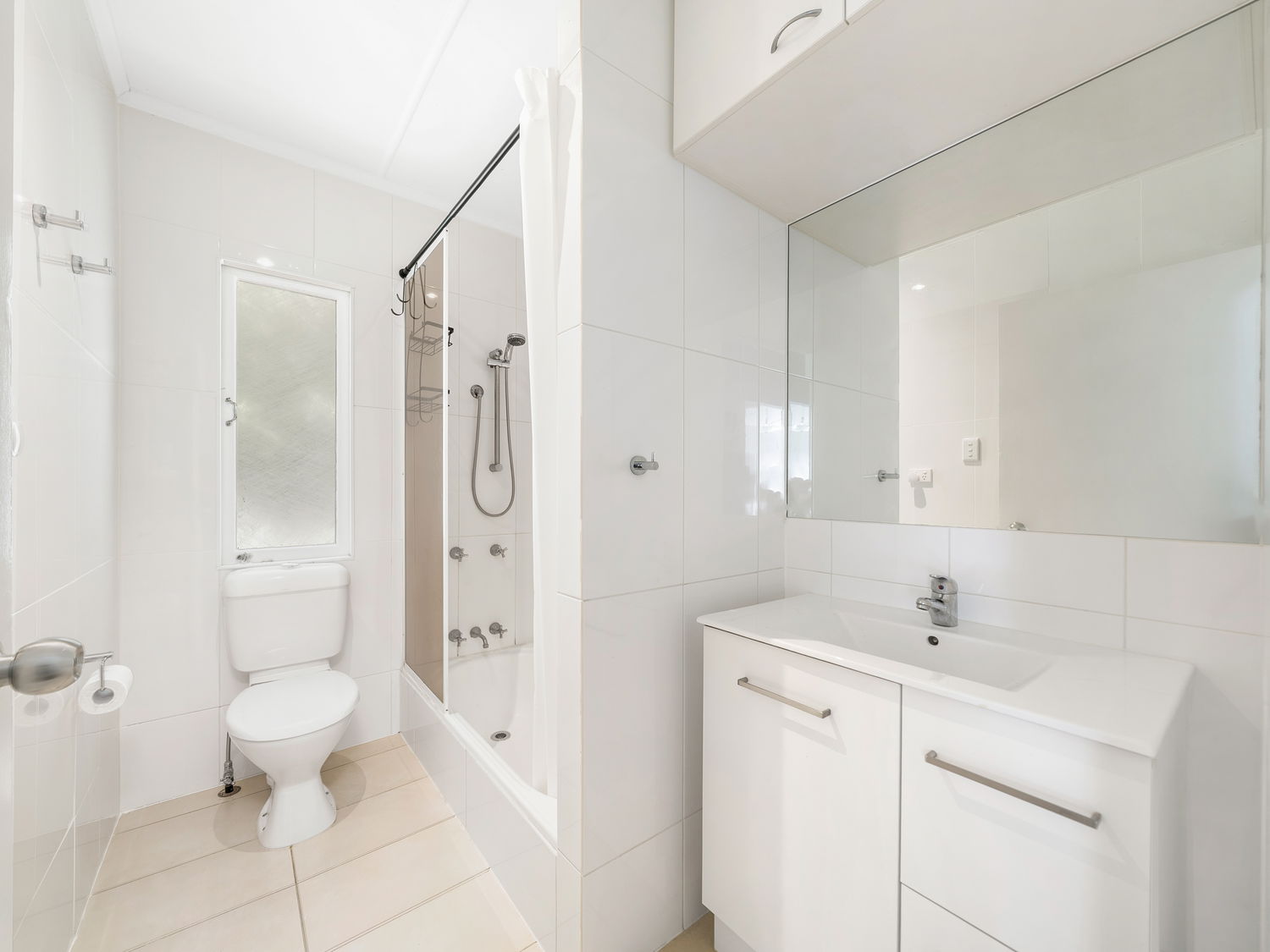 # Neat bathroom with toilet, shower over bath and storage to vanity