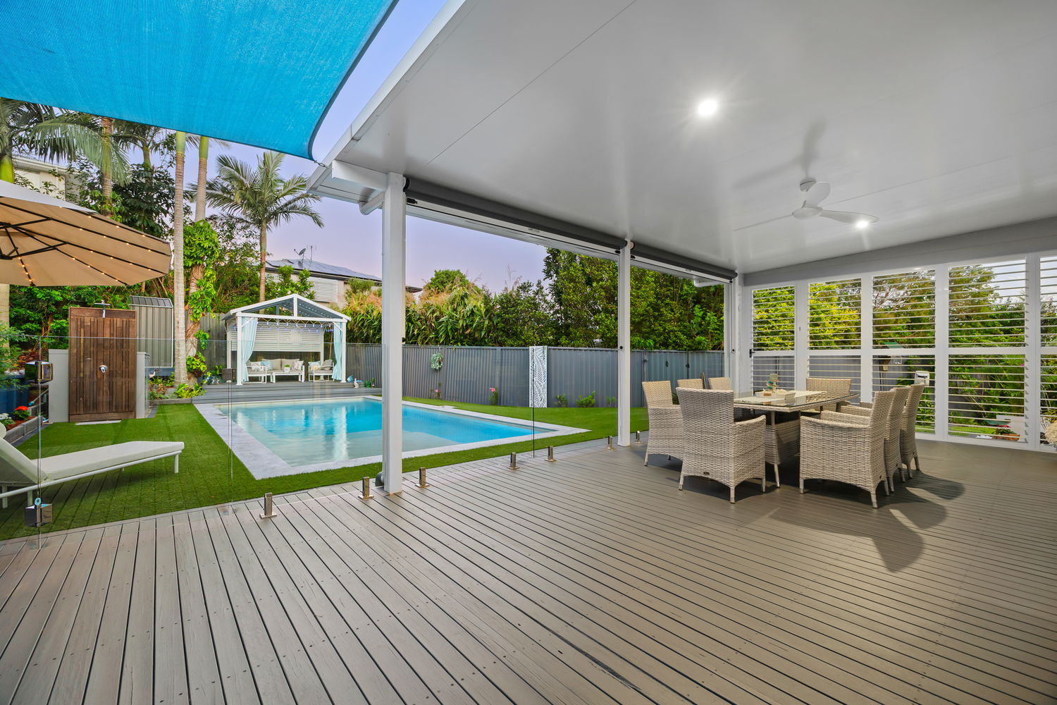 All-season undercover alfresco with plantation shutters, ideal for year-round entertaining