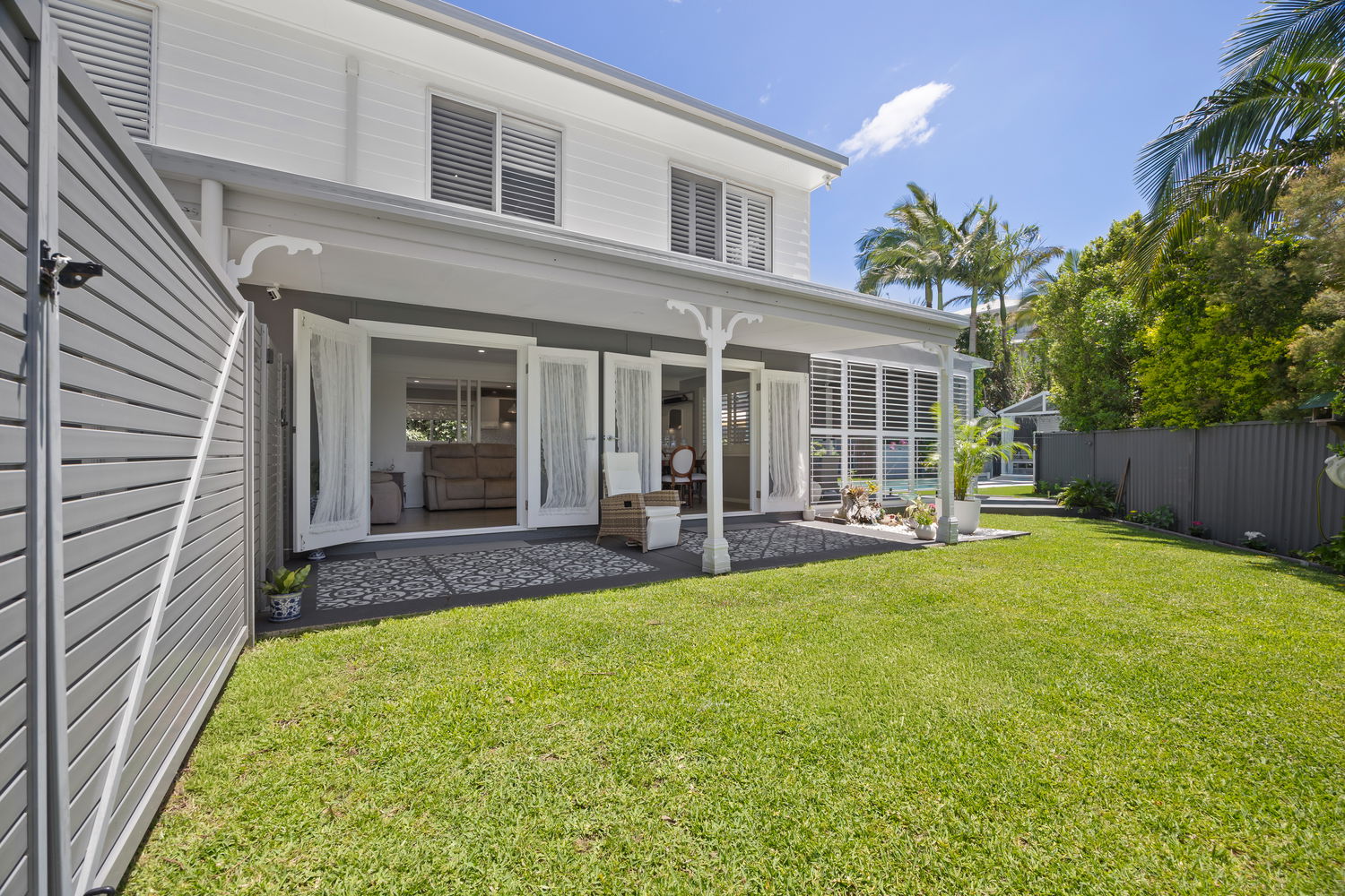 Light-filled open-plan living and dining flowing through French doors to the fenced courtyard area with established lawns